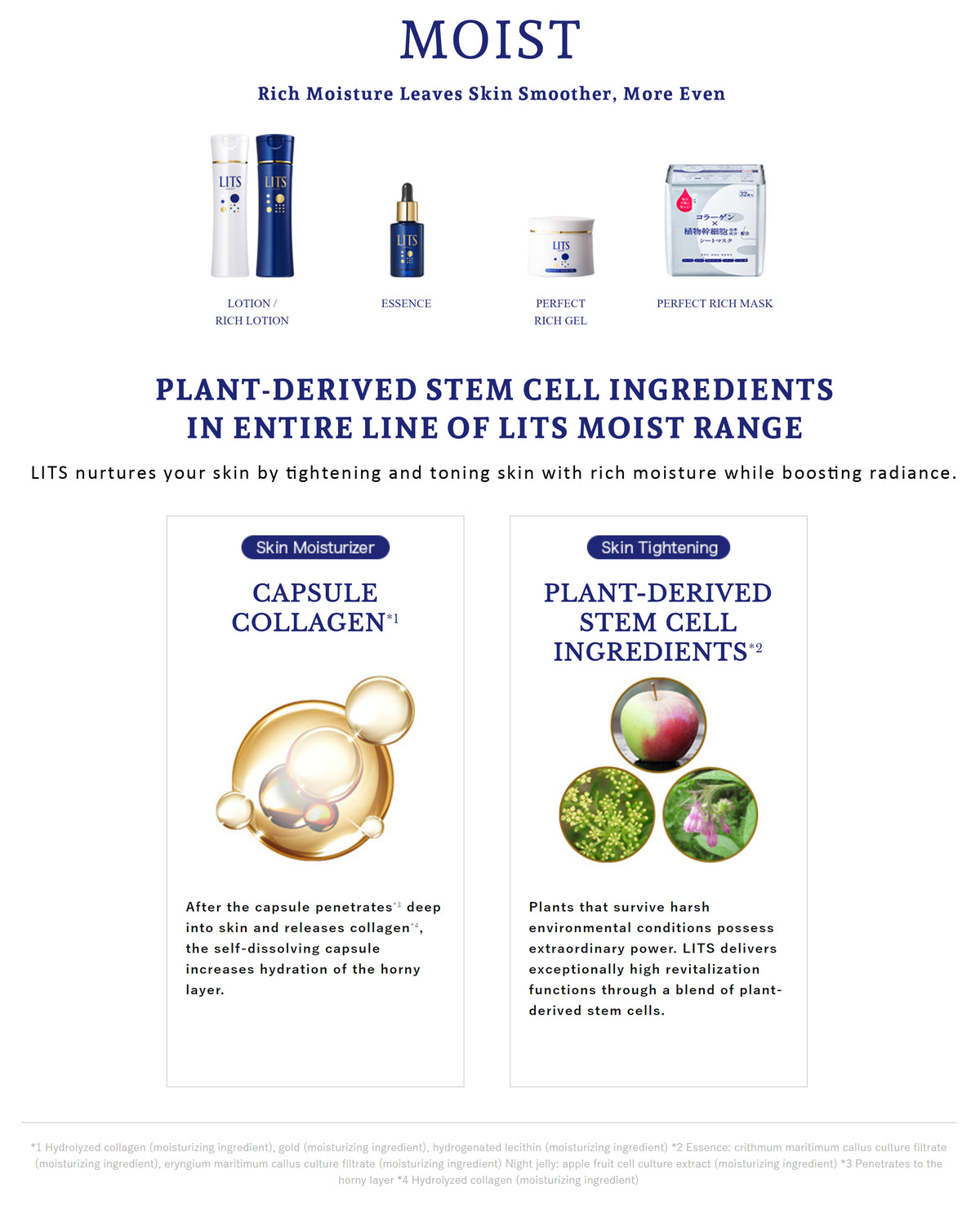LITS Moist VC Lotion features 3 types of Vitamin C derivatives (Trisodium Ascorbyl Palmitate Phosphate, 3-O-Ethyl Ascorbic Acid & 3-Laurylglyceryl Ascorbate) and a special blend of plant-derived stem cells ingredients (Swiss Apple, Comfrey root & Saponaria pumila stem cells) to...